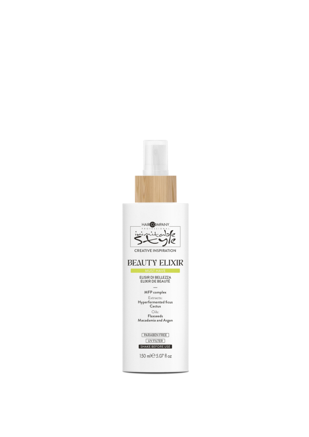 INIMITABLE STYLE BEAUTY ELIXIR je tajemný zdroj věčného mládí vašich vlasů. Dokonalá odpověď na otázku, jak dodat vlasům novou pružnost, lesk a hebkost, zejména pokud jsou namáhané a oslabené. Tento must-have produkt s vysokým obsahem aktivních látek chrání vlasy před teplem z fénů/ žehliček, zabraňuje krepatění, hydratuje vlasy a usnadňuje jejich rozčesávání, a to rychle a bez zatížení. Dodává vlasům objem, posiluje je a rozjasňuje, opravuje jejich poškození a zabraňuje roztřepení konečků. Vlasy budou okamžitě neodolatelně hebké a hedvábné.