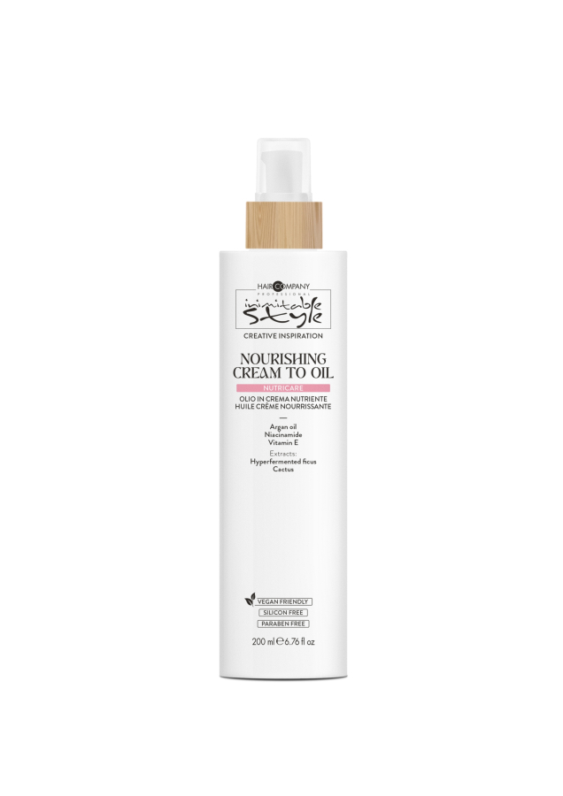 INIMITABLE STYLE NOURISHING CREAM TO OIL je mimořádně všestranný produkt. Když se použije na vlhké vlasy hned po umytí, hydratuje je a zjemňuje a obnovuje jejich plnost a měkkost. Když se aplikuje po vysušení, zvýrazní přirozený lesk vlasů. Vytváří také ochranný film na vlasu, který chrání před vnějšími vlivy. Vlasy uhladí a zkrotí tak, že budou vypadat poddajně a smyslně. Není mastný a nezatěžuje konečky.