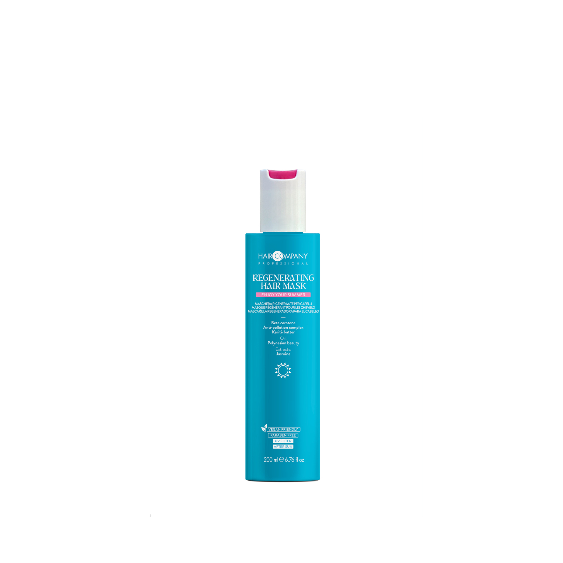 REGENERAČNÍ VLASOVÁ MASKA je péče pro vlasy zatížené sluncem, solí a chlórem. Obsahuje jasmín s posilujícím účinkem, beta-karoten s antioxidačním účinkem, bambucké máslo pro hlubokou výživu, anti-pollution komplex pro ochranu proti znečišťujícím látkám a polynéský kosmetický olej pro opravu a uhlazení. Obnovuje vlasy zatížené sluncem, solí a chlórem.